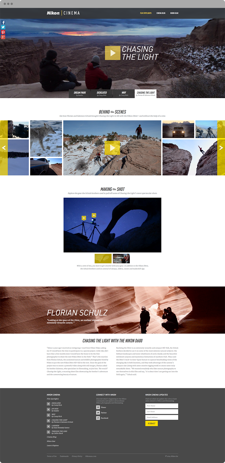 Nikon Cinema was designed to showcase the wondrous capabilities of using a Nikon DSLR for personal and commercial filmmaking. It gives a behind-the–scenes look into DSLR filmmaking by top directors and producers.