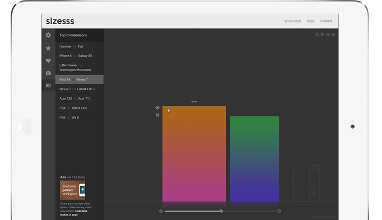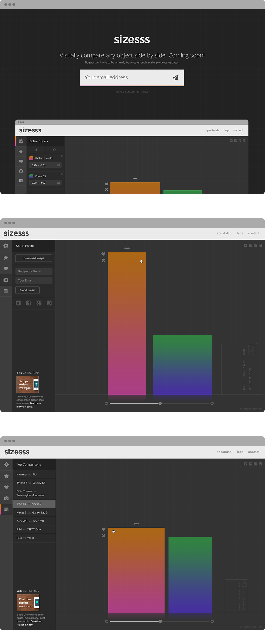As the lead product designer, I designed Sizesss to generate actual size comparisons of two or more objects. Objects can be manually inputed or selected from a crowdsourced library and then saved for sharing.